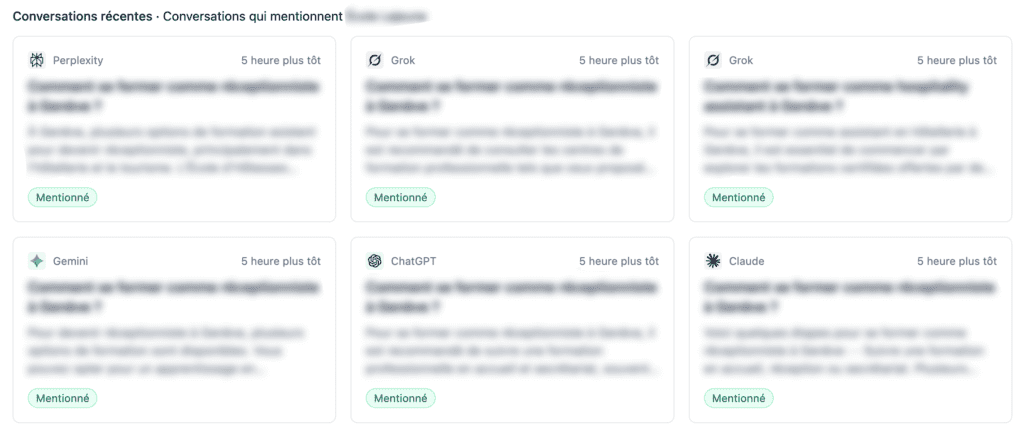 Ils permettent de suivre l’évolution de la visibilité, la fréquence des mentions et les variations de positionnement dans les réponses générées.